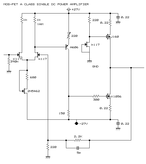 MOS−FET A級シングルアンプ このジャンルはPASSラボラトリーのものが有名ですが、このアンプは それとかなり似通ったものになっています。 A級シングルアンプは、B級プッシュプルに比べてやはり微小信号が 細かく正確で、情報量が多いと思います。 (1996年9月製作)