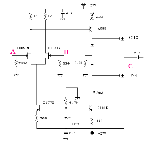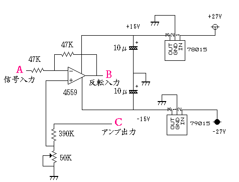 無帰還フラットアンプにはこのような回路を採用しました。ゲインを確定する