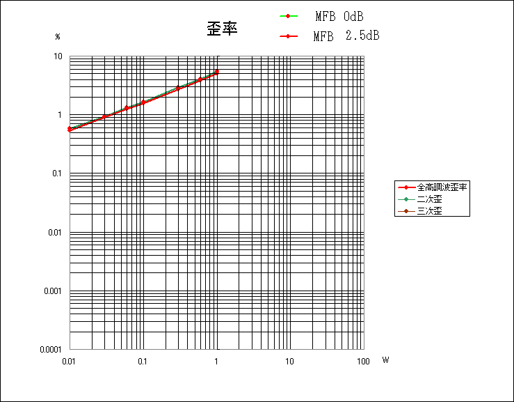 三次歪のほうが全高調波歪より大きいのは変だが、まあこれは誤差。