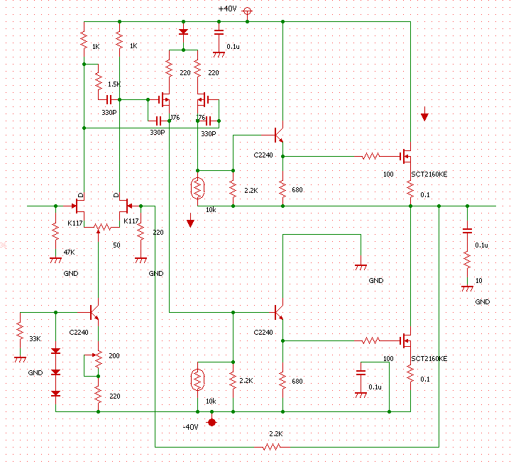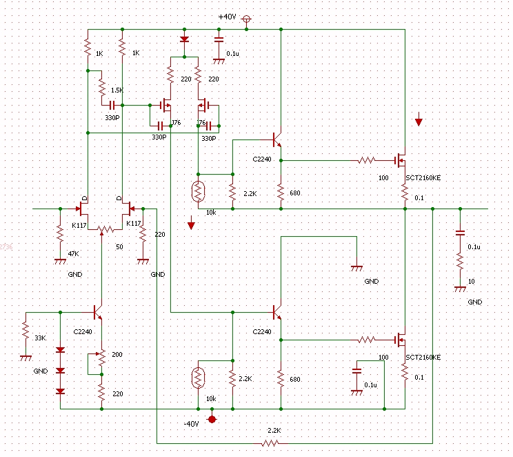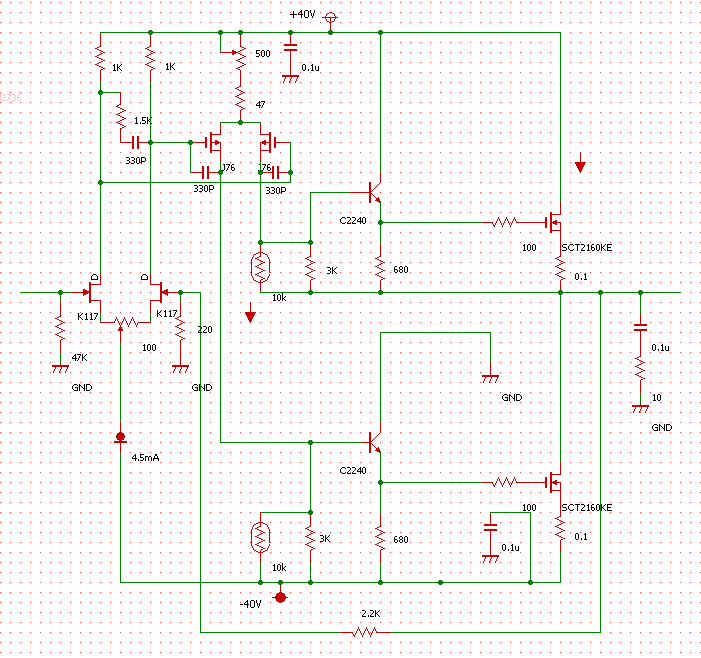 ほぼ金田式をコピーした回路。二段目がソース接地になっている。差動よりもダイナミックレンジが大きく取れる。