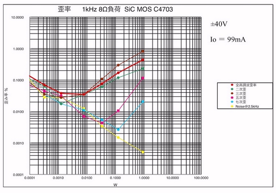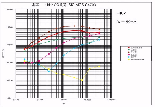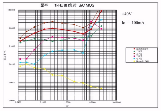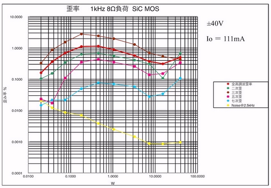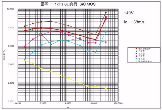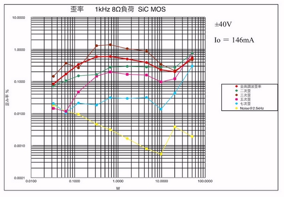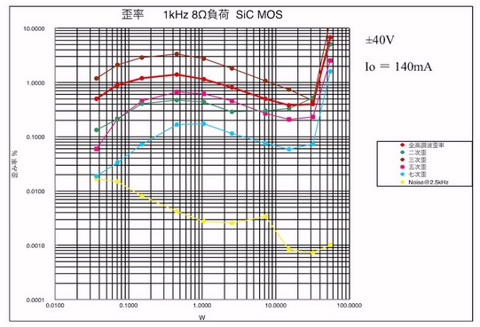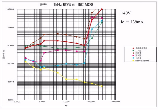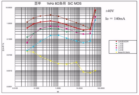 40Wからハードクリップが起こり、歪みも全体的に増加しているようだ。