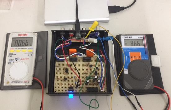 光電式イコライザーを繋いでみて、実際の電圧を確認する。緑と青間で4.9V出た。