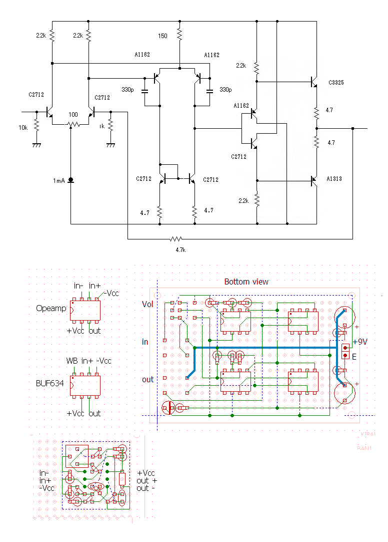 この回路はシュールな感じがする。入力インピーダンスが低いので送りだしが電流出力でなければ